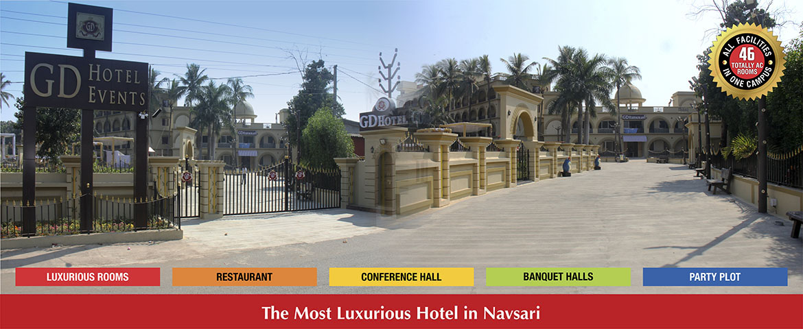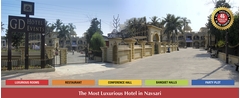 The GD HOTEL, one of the best hotel located in the prime commercial area of South Gujarat known as Navsari. The most ideal place to stay having 46 full facility star category luxurious room like Executive, Deluxe, Super Deluxe, Luxury, Presidential Suite and GD Grande. We also have a Purely Vegetarian Restaurant which offers multi cuisine food and fully air conditioned banquet halls for parties, corporate seminars and meetings.